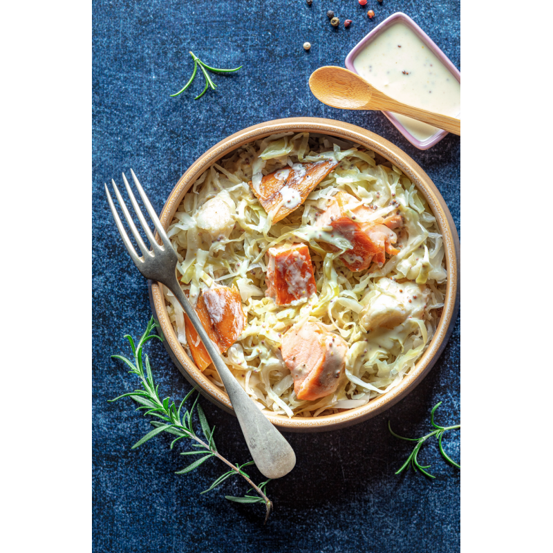 NOTRE RECETTE : JULIENNE ou LINGUE (en fonction des arrivages), SAUMON FUMÉ, SAUMON FRAIS, MAQUEREAU FUMÉ, chou, CRÈME, VIN BLANC, FUMET DE POISSONS, baie de genévrier, BEURRE, FARINE, MOUTARDE DE DIJON, MOUTARDE À L'ANCIENNE, laurier, sel, poivre