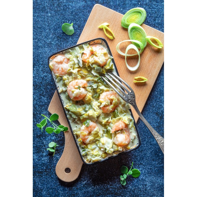 NOTRE RECETTE : CREVETTE, poireau, CRÈME, BEURRE, sel, poivre