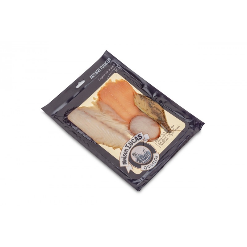 L' assortiment de poissons fumés de notre Maison ! Découvrez 4 textures et saveurs différentes avec une tranche de saumon fumé, une tranche de lieu noir fumé, une tranche de thon fumé, un morceau de filet de maquereau fumé.