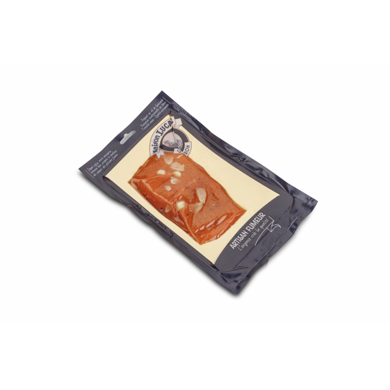 Ingrédients : TRUITE * (ONCORHYNCHUS MYKISS), sel de Guérande, fumaison délicate au hêtre façon mi-cuit, SAUCE SOJA, miel, ail, gingembre, citron vert.