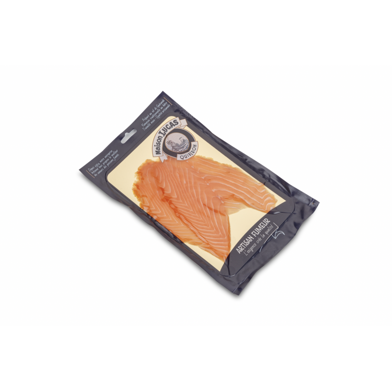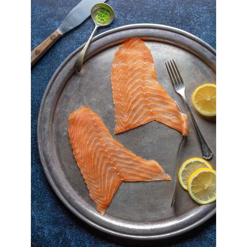 2 tranches réalisées en qualité main. Filet entièrement salé en sel sec de Guérande puis fumé lentement à la sciure de hêtre vert. Une invitation à la dégustation.